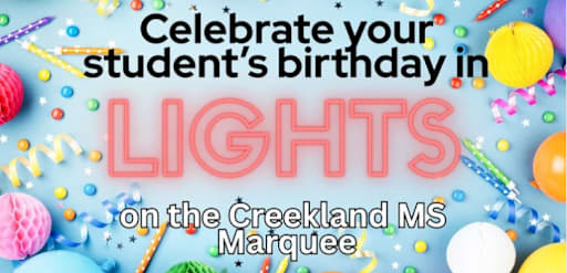 For only $25 dollars you can purchase a "Happy Birthday" message with your child's name on our Creekland Middle School Marquee, out in front of the school. Their name will be on the marquee for their Special Birthday.